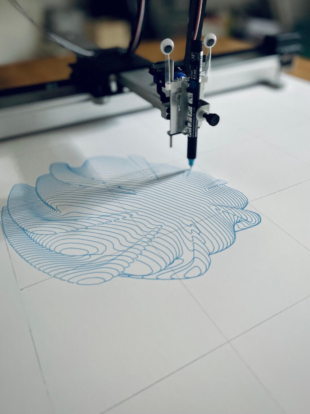 The photo shows my pen plotter with googly eyes tracing a shape generated through playful transformations: a simple coded vector graphic, extruded into 3D, sliced into iso-contours, flattened back into 2D vector, and plotted on paper.